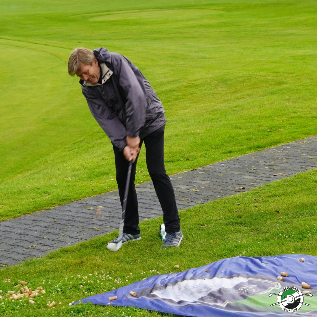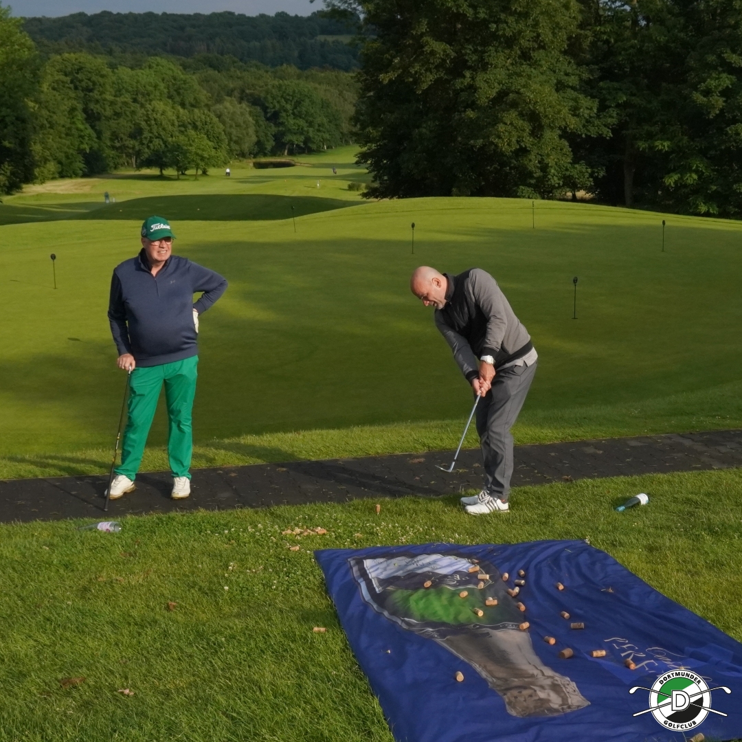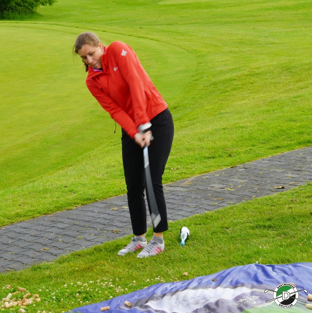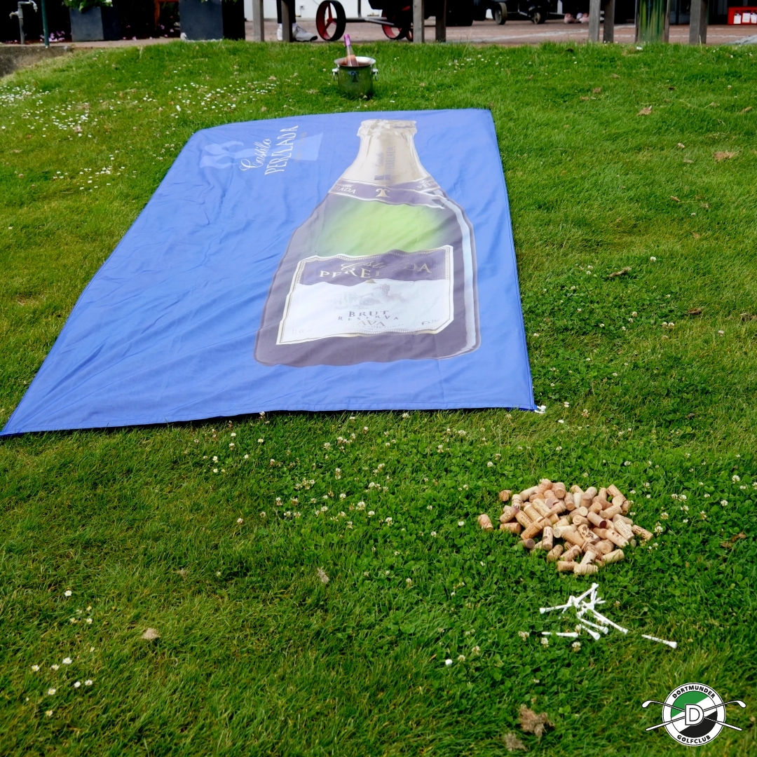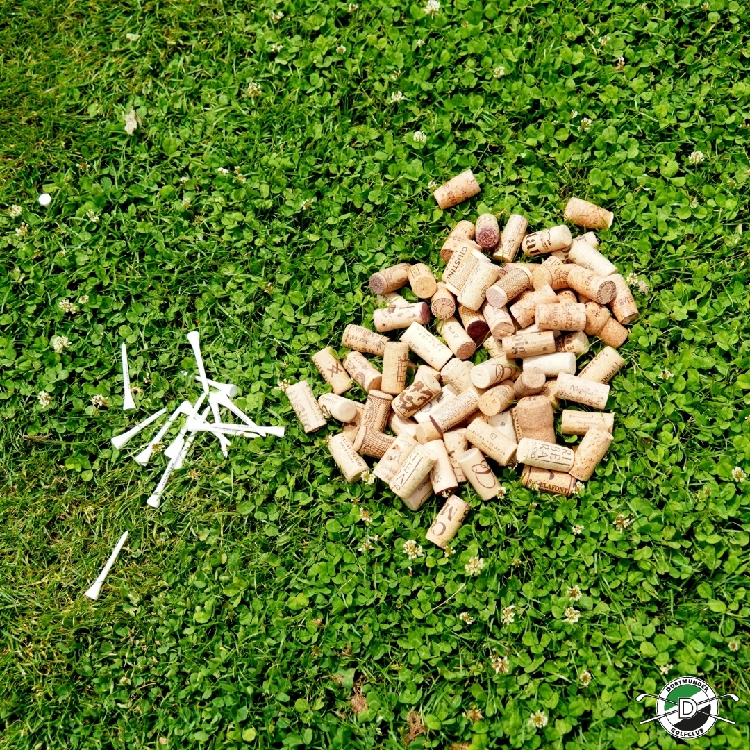 In der Halfwaypause wurden die leeren Akkus mit den schon oben erwähnten Leckereien aufgetankt und mit Rundenverpflegung in Form von Wein und Bier ging es auf die zweite Runde. Nach der Runde war an „Loch 19“ eine Flasche Sekt zu gewinnen – sofern es gelang, einen Sektkorken in einen Sektkübel zu schlagen. Jeder Versuch kostete 5 EUR.