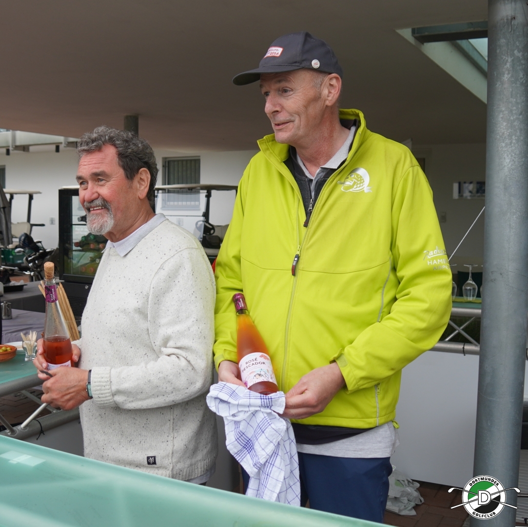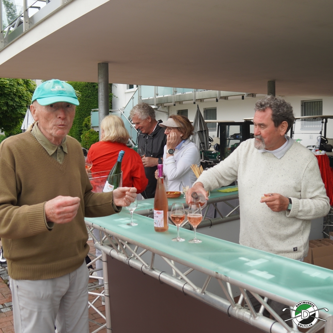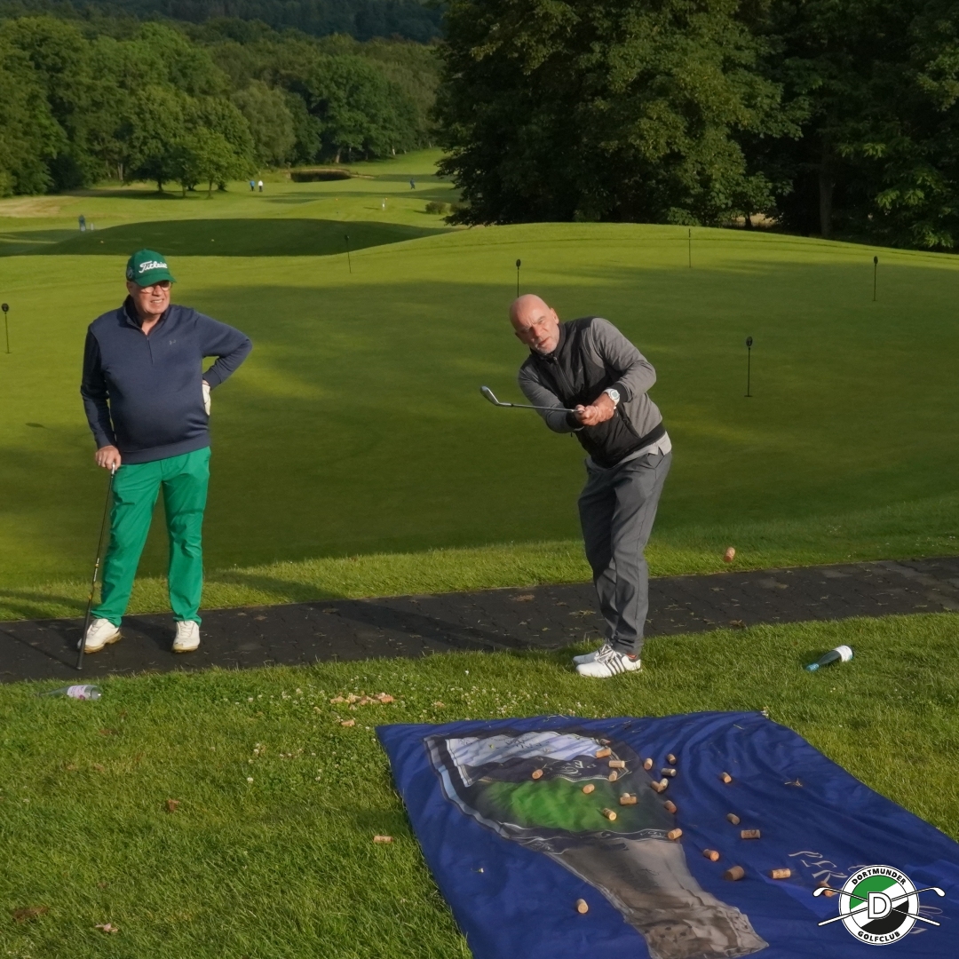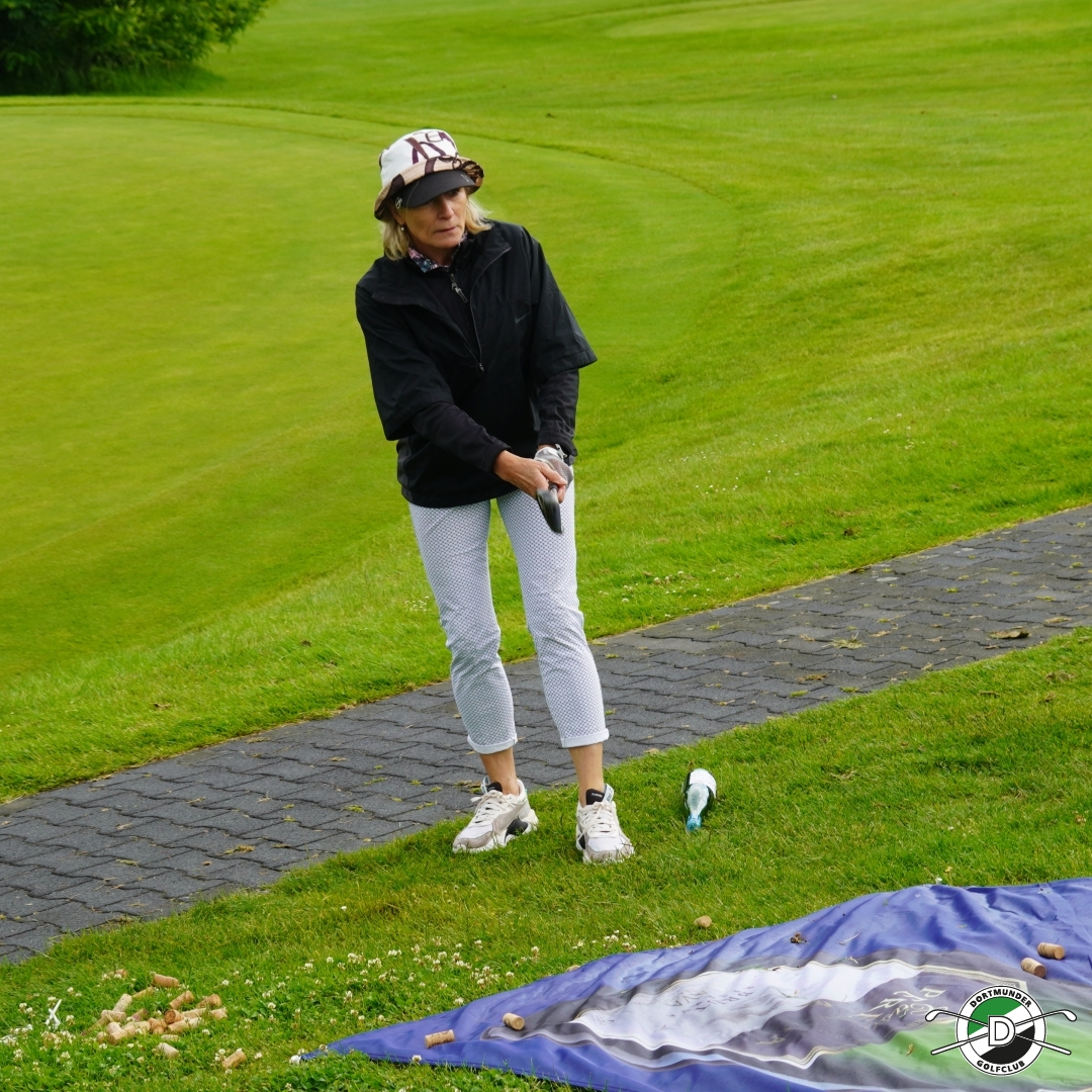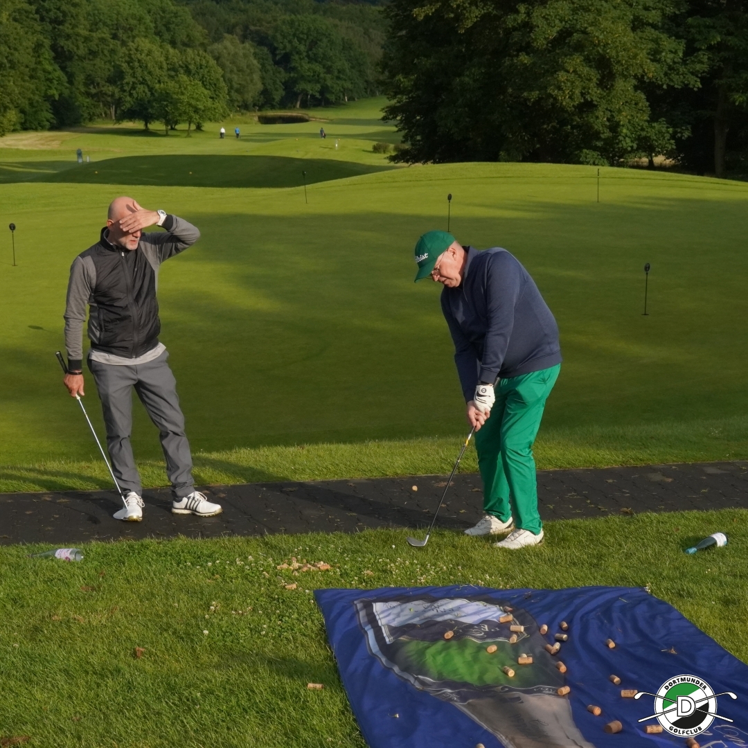 In der Halfwaypause wurden die leeren Akkus mit den schon oben erwähnten Leckereien aufgetankt und mit Rundenverpflegung in Form von Wein und Bier ging es auf die zweite Runde. Nach der Runde war an „Loch 19“ eine Flasche Sekt zu gewinnen – sofern es gelang, einen Sektkorken in einen Sektkübel zu schlagen. Jeder Versuch kostete 5 EUR.