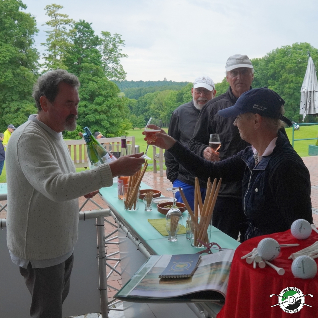 Für eine gute Stärkung sorgen schon vor Turnierbeginn Kuchen, Quiche Loraine, Frikadellen, Mettwürstchen, Brot mit unterschiedlichen Dips, sowie Bier und Schnäpschen. Der überaus charmante Chef der Bodegas Rioja aus Witten, Andreas Krämer mit seinem Mitarbeiter Ralf Dippel und einer mobilen Weintheke vor Ort, spendierte großzügig köstlichen Rose und Weißwein. So stimmten sich die Teams, bevor sie überhaupt zum Schläger griffen, mit einem Schnäpschen oder Weinchen auf das Turnier ein. Immer wieder war auf dem Platz fröhliches Lachen und Juchzen zu hören.